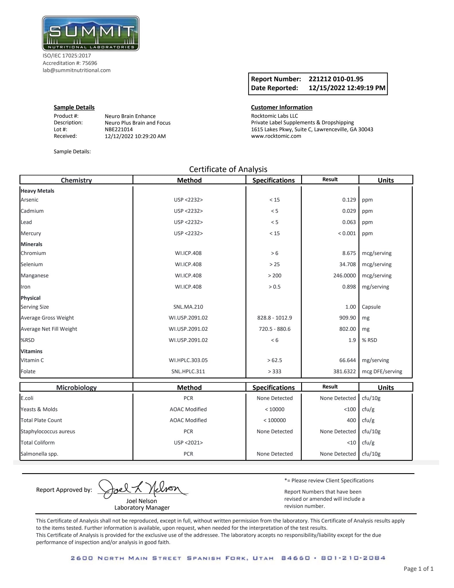 Neuro Plus is formulated to boost cognitive function, mental clarity, focus, immune function, and energy production. Our product is synthesized utilizing the latest scientific research and formulated with high-quality ingredients. Our formula is third-party independently tested for heavy metals, impurities, made in the USA, GMP certified, and produced in an FDA registered facility. 1% of the supplements on the market can match our world-class standards.